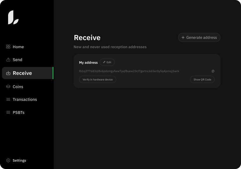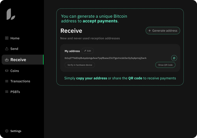 Receive Bitcoin with ease—your wallet address and QR code are ready for any transaction.